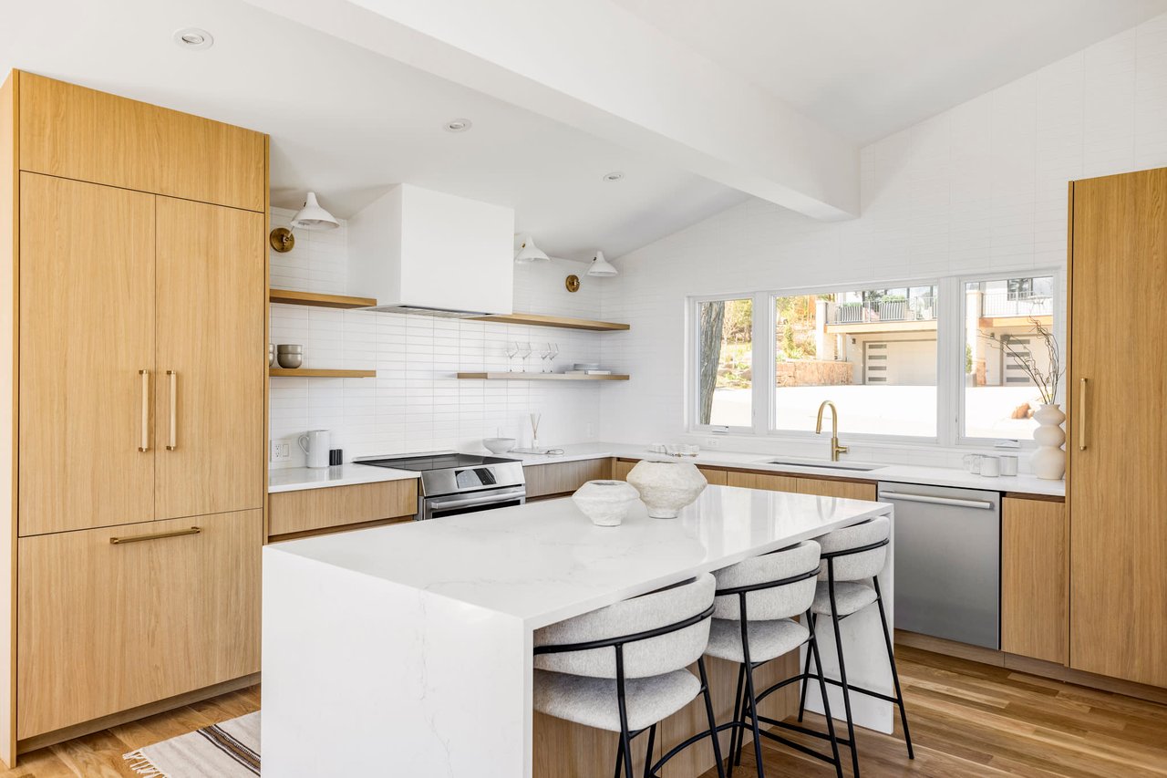Inside the stunning residence are soaring ceilings, white oak floors, massive windows and designer lighting fixtures which accentuate the home's bright and airy ambiance. The dramatic great room draws you in with an entire wall of windows capturing glorious southern sunlight and winter views of Green Mountain and Bear Peak. Enjoy a generous footprint for seating and dining in this sun-kissed space, or step out to the deck for al fresco lounging and dining overlooking the rear yard. The open concept gourmet kitchen impresses with white oak cabinetry, Quartz countertops, a dramatic white backsplash and a wide island. Brass hardware and exposed shelving add a contemporary touch, while the state-of-the-art appliance package includes a vented induction range, paneled refrigerator and dishwasher by Bosch, plus a Bosch speed oven/ microwave drawer. Off the entry, you'll find a flexible office space and powder room accessible via pocket doors from the foyer and the kitchen.