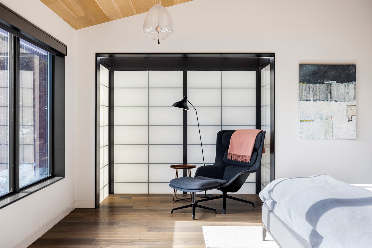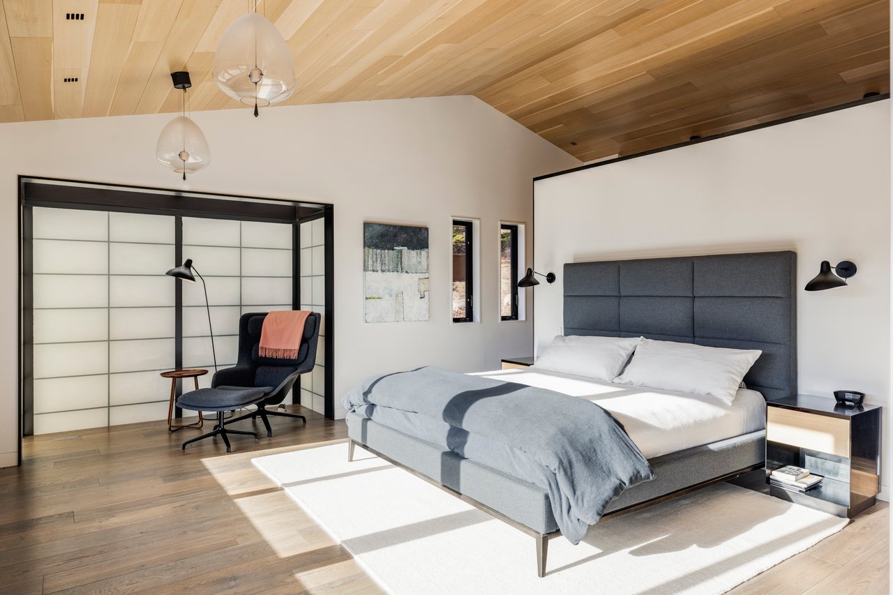 The primary bedroom blends comfort, style, and views. A rift-sawn white oak ceiling creates a cozy atmosphere, while handmade blown-glass pendant lights add a touch of sparkle. The adjoining bathroom is a design marvel, featuring a custom concrete countertop and sink atop a walnut vanity, with a thoughtfully designed metal surround that elegantly conceals switch plates and lighting fixtures. A soaking tub and glass-paneled shower rest on thermally modified ash floors and enjoy private, floor-to-ceiling views of the surrounding wilderness. Step outside to stargaze from the outdoor shower and private seating area.