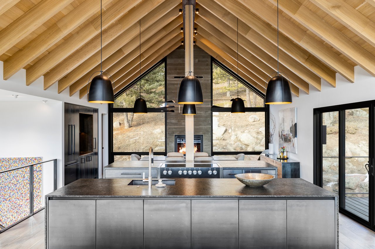 The home's entry experience is a masterpiece of design, featuring a sculptural staircase that combines black concrete lower steps with LED lighting and an upper flight of glass and steel. Above, you're welcomed into an expansive open-concept living space where the kitchen takes center stage. Two blackened-steel islands, spanning 22 feet, create a social cooking environment, inviting interaction from all angles. On one island, the leathered granite waterfall countertops surround an AGA Marvel induction range, while the second island hosts a deep sink and excellent work space. The kitchen is a testament to intentional design, with custom blackened-steel cabinetry by Aspen Leaf Kitchens, while paneled appliances maintain a clean aesthetic, ensuring the kitchen remains an integrated part of the living space. Overhead, white-oak planks and a cold-rolled steel beam pay homage to the home’s original timber rafters while adding a contemporary twist. Six oil-rubbed bronze pendants with brass interiors provide warm, atmospheric lighting, creating a dramatic culinary centerpiece.